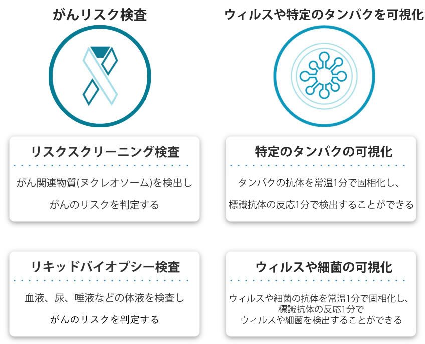 「プロテオ®」は様々な活用ができ、現在、がん関連物質(ヌクレオソーム)を検出し、がんのリスクを判定する「リスクスクリーニング検査」と、同様にがんのリスクを判定する「リキッドバイオプシー検査」のほかに、抗原抗体反応により、ウィルスや特定のタンパクを可視化する新たな検査法などがあります。これは、プロテオ®バイオチップ表面の結合粒子を可視化して数値化する検査法です。
