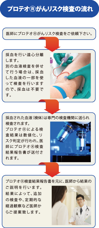 対象となるのは、膵がん、肺がん、乳がん、胃がん、大腸がん、食道がん、咽頭がん、舌がん、胆道がん、肝がん、甲状腺がん、腎臓がん、膀胱がん、前立腺がん、子宮がん、卵巣がん、脳腫瘍などの固形がんで、体内にがんが発生した場合に血液中に微量溶け出すがん関連物質を、新型バイオチップであるプロテオ®を用いて測定・数値化し、がんのリスクをA(リスク低)・B(要観察)・C(リスク高)の三段階に分類・判定します。