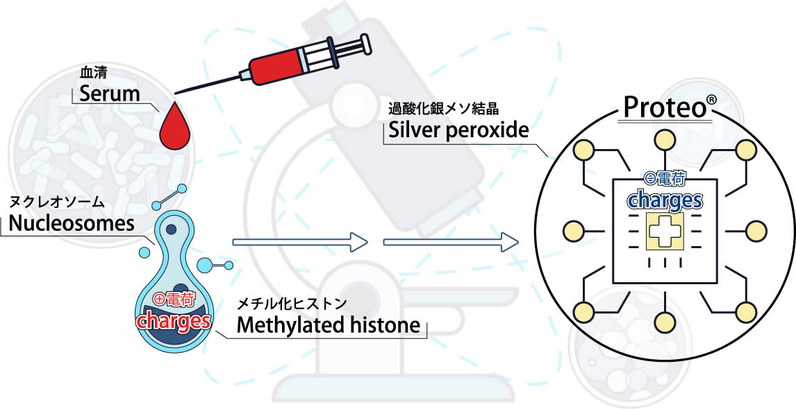 がん関連物質:DNAを含むタンパク複合体(ヌクレオソーム推定)はプロテオ®チップに形成された新規物質、過酸化銀メソ結晶と反応し吸着されます。