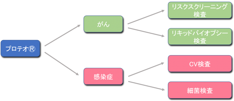 「プロテオ®」は様々な活用ができ、新型コロナウイルスを検出する「CV検査」のほかに、感染症を引き起こす細菌を検出する「細菌検査」や、がん関連物質(ヌクレオソーム)を検出しがんのリスクを判定する「リスクスクリーニング検査」と、がんの有無を判定する「リキッドバイオプシー検査」があります。