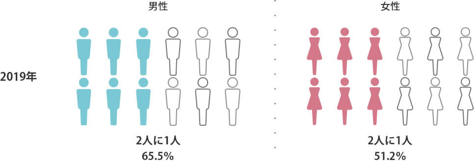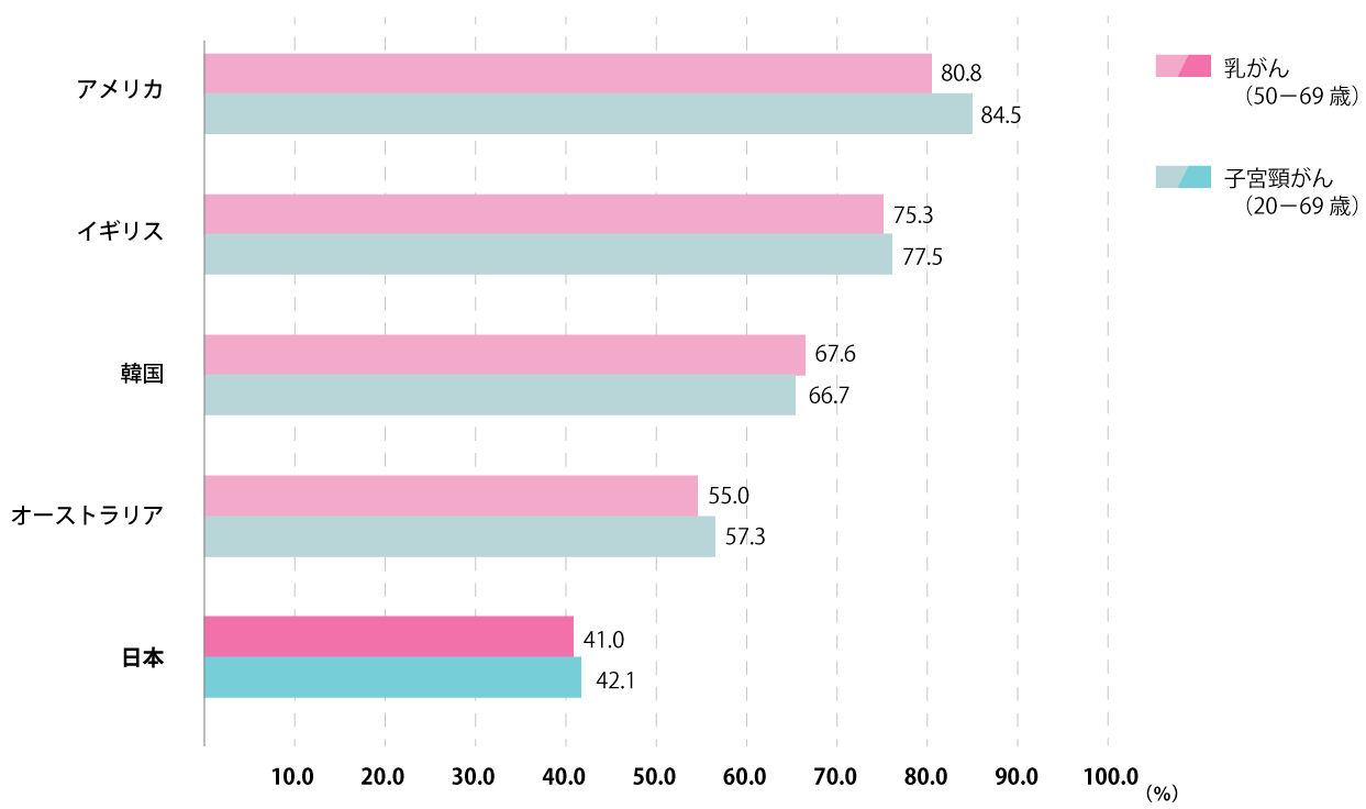 日本の検診受信率は、国際的に低い値となっています。アメリカと比べると約40ポイントも下回っています。