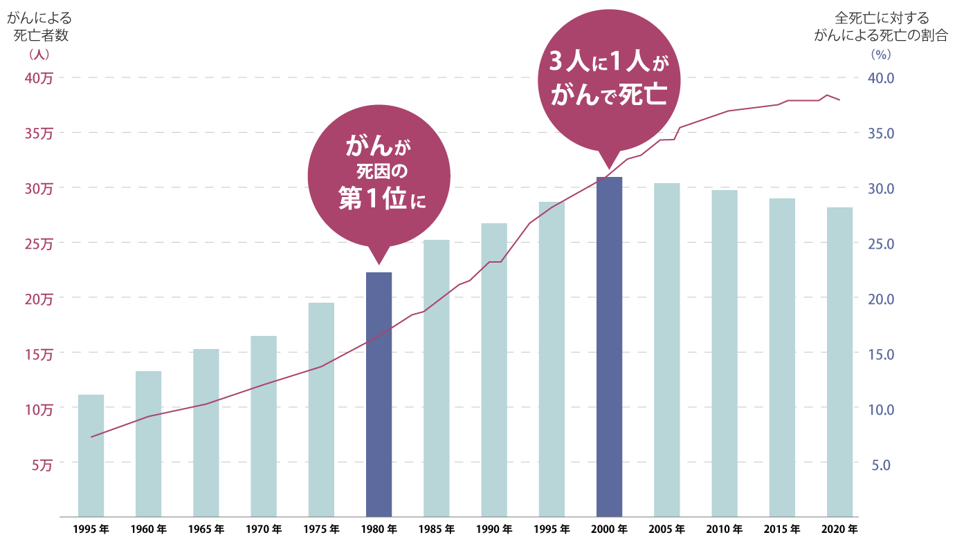 1981年(昭和56年)以降、がんは死因の第一位となり、現在3人に1人ががんで亡くなっています。