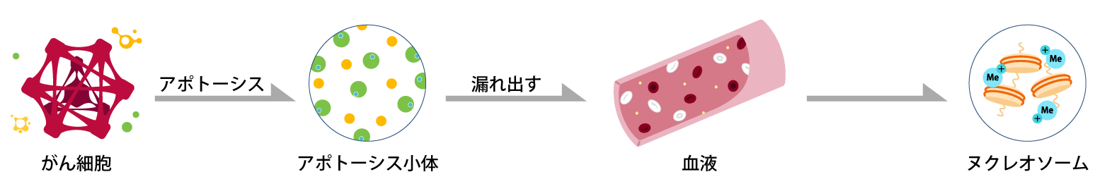 アポトーシスを起こしたがん細胞から血液中に断片化したヌクレオソームが漏れ出します。