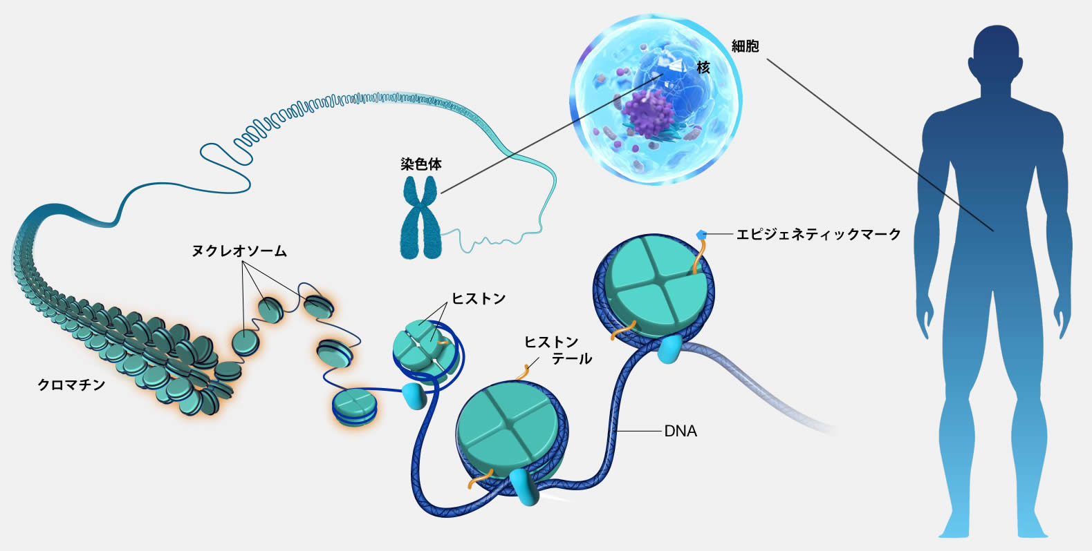 ヌクレオソームは、染色体の基本構成単位で、ヒストンと呼ばれるタンパク質にDNAが1.75回巻き付いた複合体で、エピジェネティクス(後天的な化学修飾)により、DNAにメチル化、ヒストンにメチル化やアセチル化などの化学修飾が起きています。