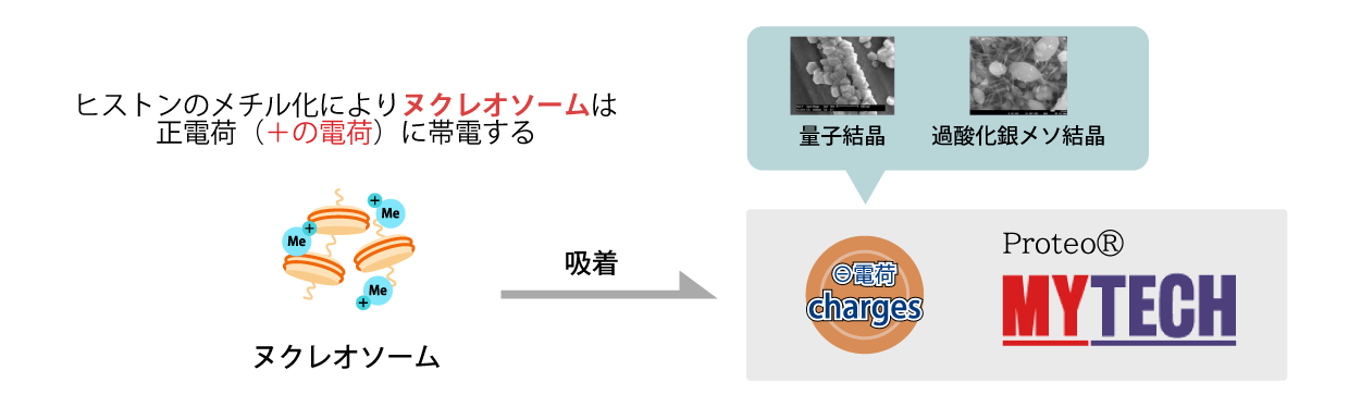 「Proteo®バイオチップ」は、量子結晶を電荷変換した過酸化銀メソ結晶と呼ばれる新規物質から出来ており、過酸化銀メソ結晶(プラズモン物質)の表面は負電荷(マイナス)に帯電しているため、正電荷に帯電したヌクレオソームを特異点に磁石のように吸着させることができます。