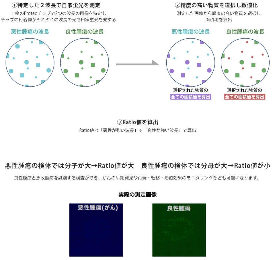 悪性腫瘍と良性腫瘍の特異的波長によるリキッドバイオプシー測定法。